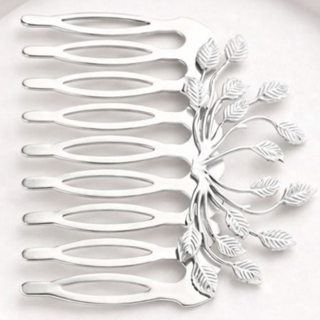 Embrace natural elegance with this lovely metal hair comb. A central cluster of finely detailed stylized leaves and branches gracefully rises from the comb's base, creating a delicate, garden-inspired silhouette. The refined finish and balanced design make this piece a timeless accessory, perfect for adding a subtle, sophisticated flair to any look.