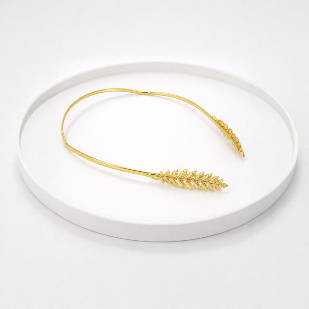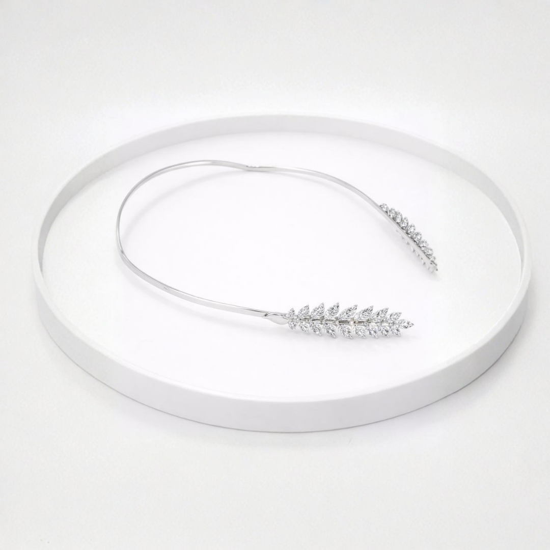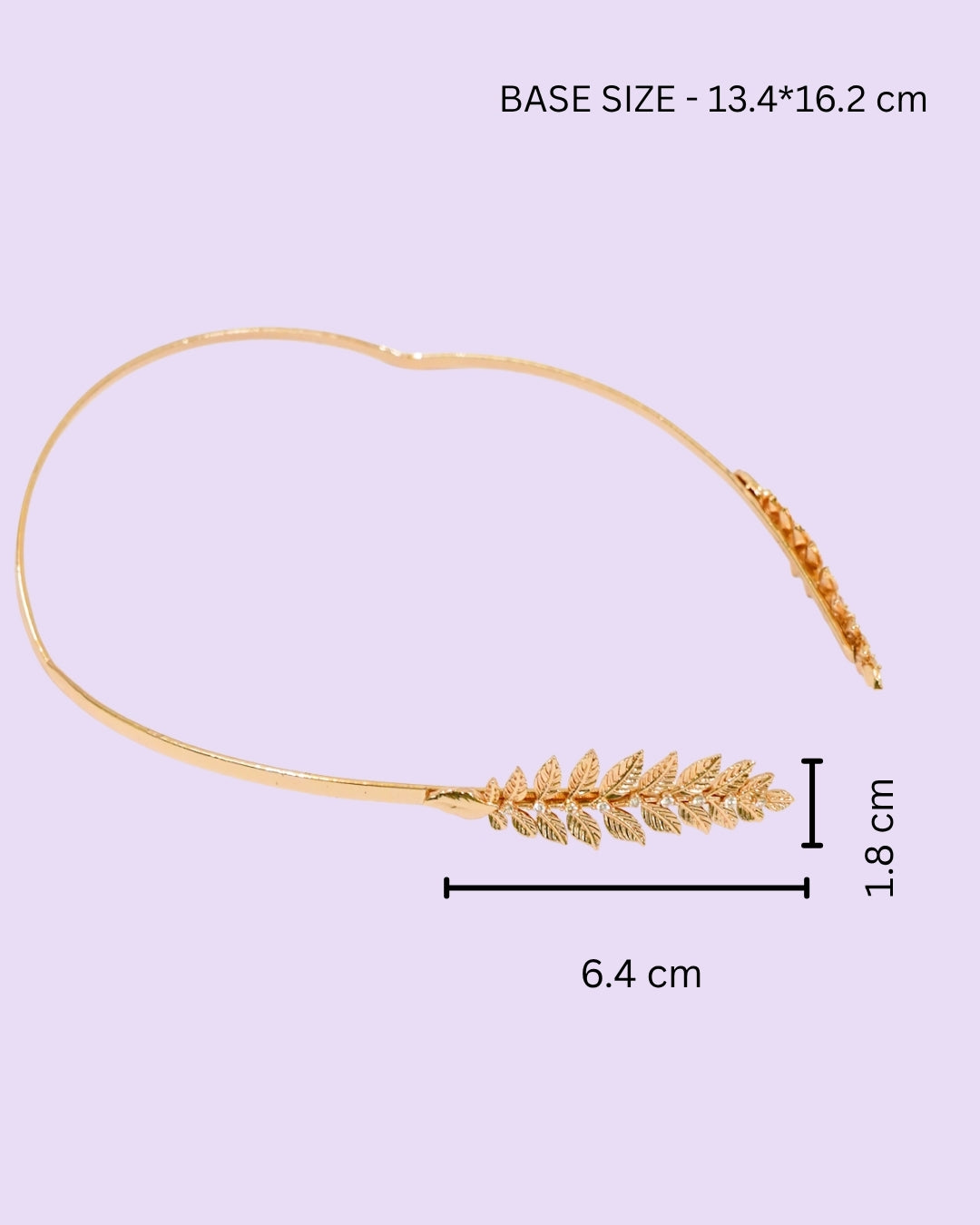 To style: Place it on the side of your head, allowing the layered, diamond-encrusted leaves to create a striking effect. The design provides a secure and comfortable fit, so you can wear it with confidence. It's ideal for framing an updo, complementing a half-up hairstyle, or simply adding a Royal touch to your flowing hair.