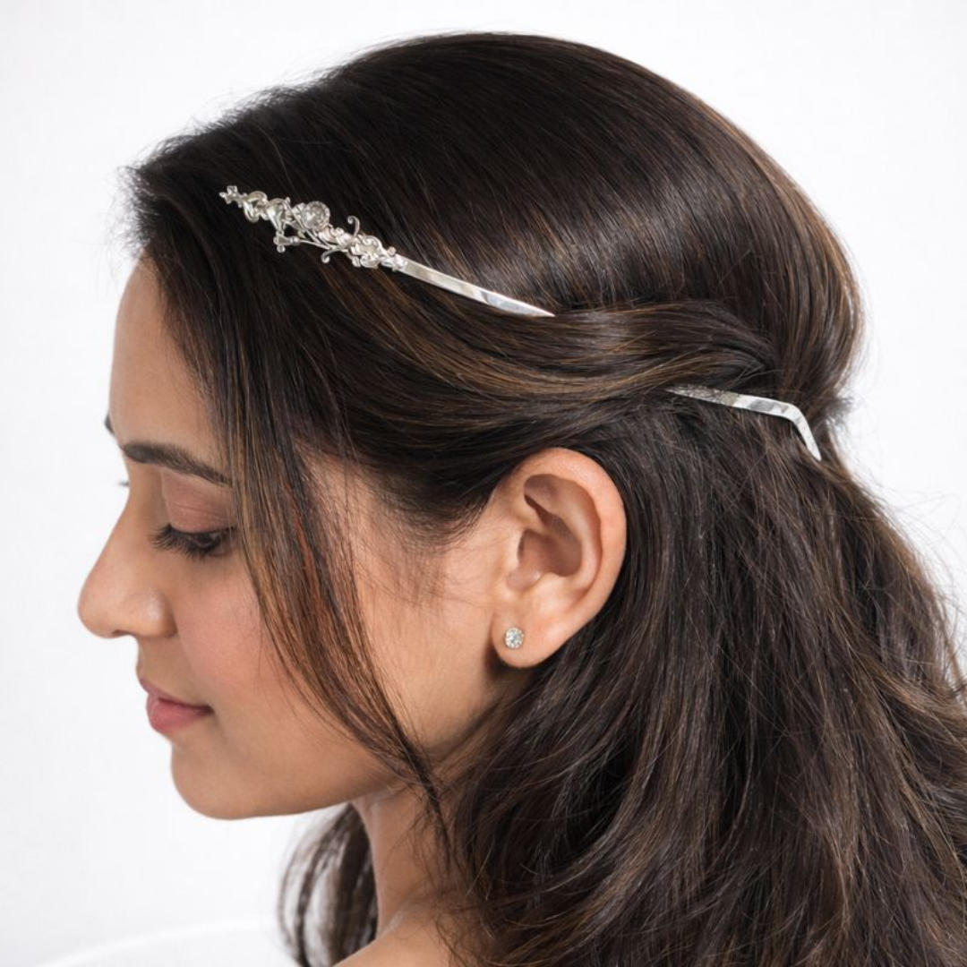 The Tiny Treasures wings is truly subtle and charming jewellery. This delicate wing features a detailed vine design with a small flower, crafted with exquisite attention to detail. Its slim profile, with a 50mm length and 20mm width, makes it a perfect piece for those who prefer a more understated sparkle. It’s an elegant way to add a touch of nature-inspired beauty to your hairstyle.